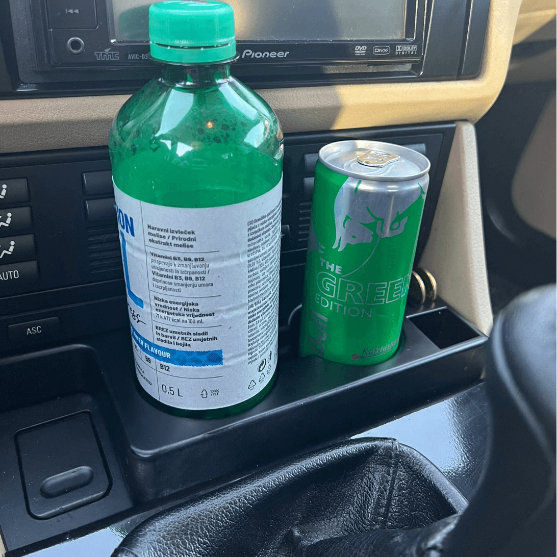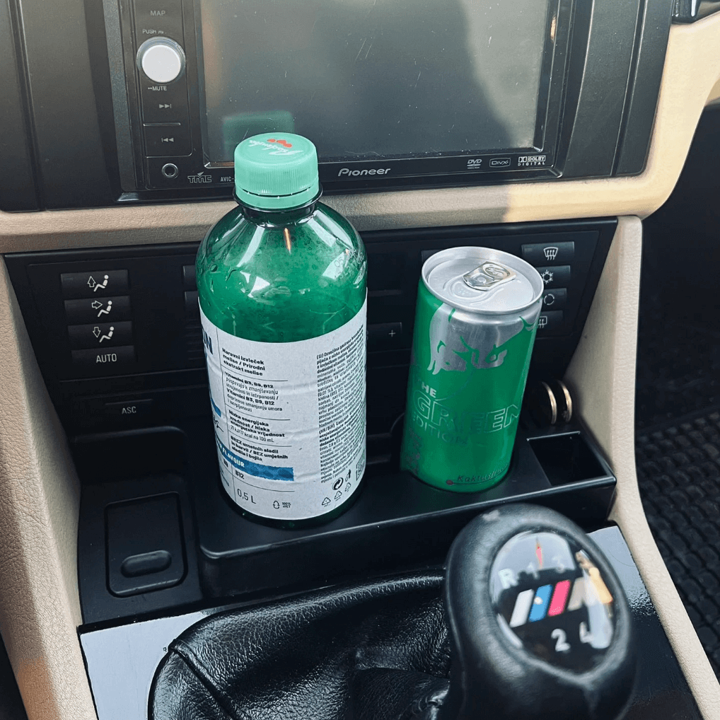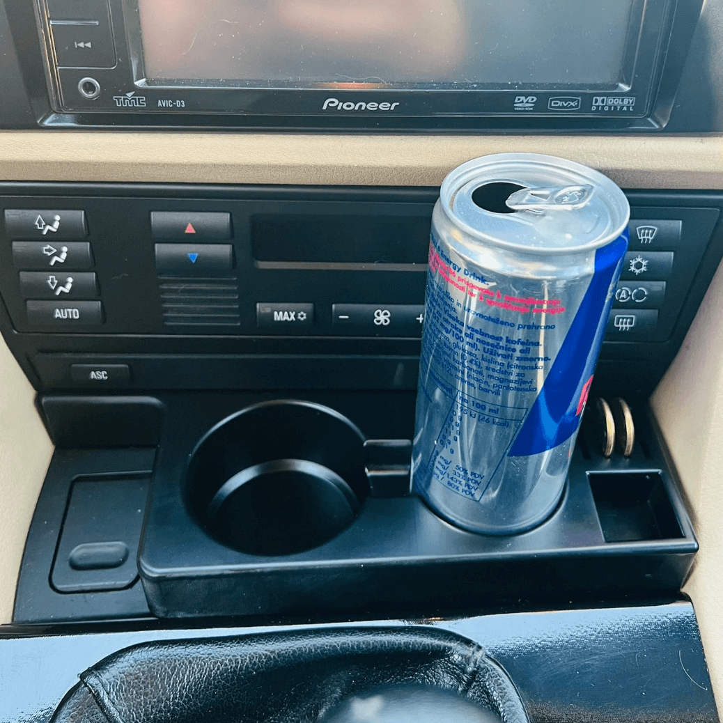 Upgrade your BMW 5 Series (E39) with our custom-fit dual cup holder, designed to combine functionality, style, and precision. This premium accessory securely holds two drinks — one slot fits cans up to 355 ml, while the other fits 500 ml bottles or larger cans.