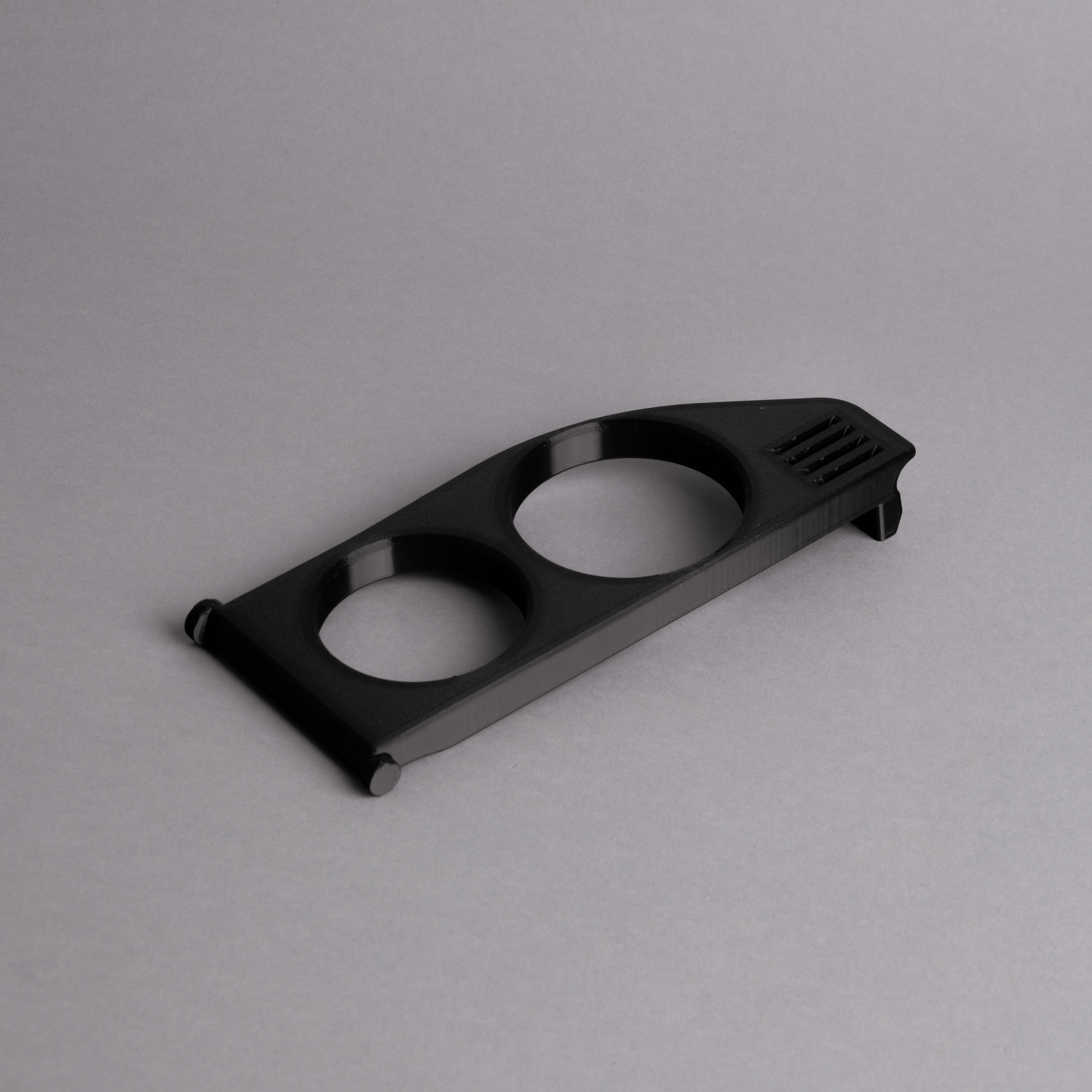 Finished in elegant black, the holder features two cup openings – one with a 66 mm diameter and another with 76 mm, providing a perfect fit for cans or bottles of various sizes.